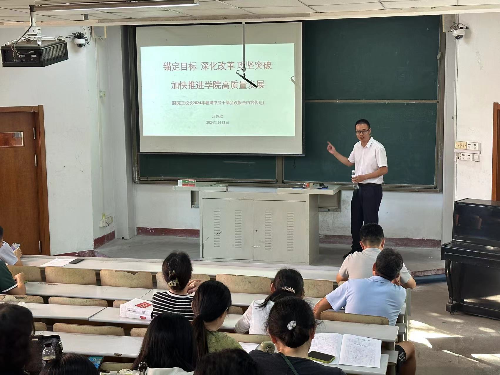 肖强传达了党的二十届三中全会、省委十二届七次全会精神,以及暑期中层干部培训班会议精神。他强调,全院教职工要充分认识到党的二十届三中全会精神的重大意义,自觉将全会精神融入日常教学科研工作中。班子成员要带头学,先学一步,学深一层,为党员、师生做好榜样、树立标杆。全体教职工要通过集中学习、分组学习与自学等形式积极开展学习活动,确保按照公司党委要求扎实推动理论学习走深走实,切实用党的二十届三中全会精神武装头脑,指导实践。