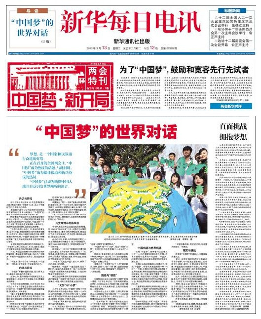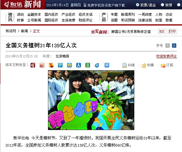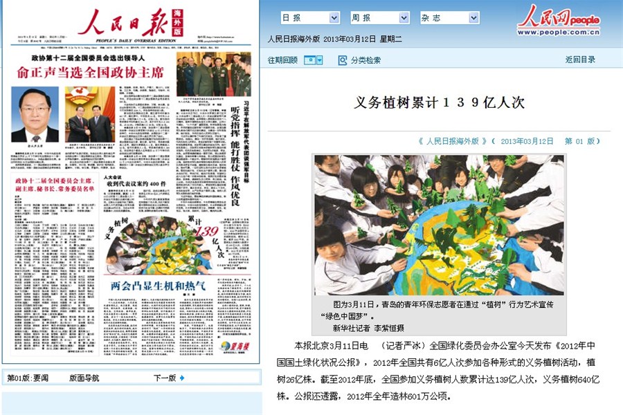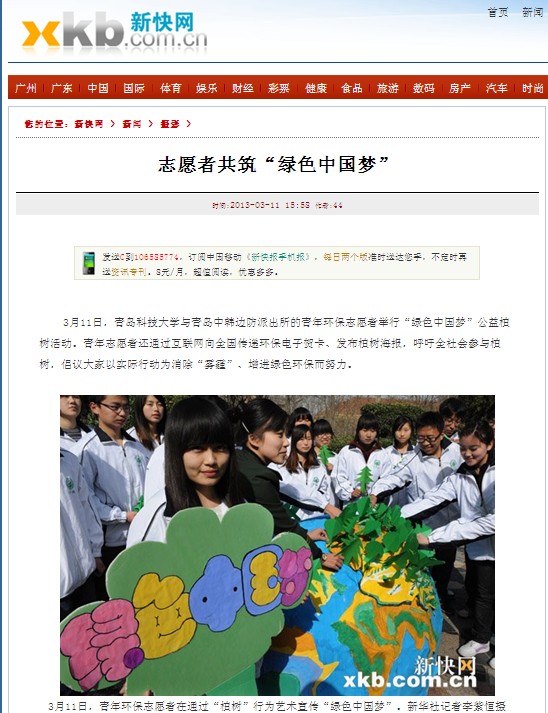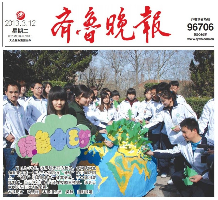 bw必威西汉姆联官方网站员工和边防派出所警官用废旧的床单、被罩,手工做成圆形的地球,地球上突出了中国的版图,从不同省份的老员工和武警中遴选出来自全国各地的代表,共同制作手工树,并将“绿树”种植在自己的家乡版图上。手工树的地球被老员工和边防武警包围在中间,寓意在当前“中国梦”的大背景下,来自全国各地的老员工和边防武警代表,带着自己的梦想,立志在自己的家乡所在地,力所能及的植树造林,强化地球之肺,为祖国的绿色大好河山,贡献微薄之力。活动进行过程中,新华社记者李紫恒给予了积极评价,并用手中的相机记录了活动的整个过程,此外齐鲁晚报、半岛都市报、崂山区电视台现场报道了本次活动,海科112班范玲芳在接受采访中说道:老员工与边防武警还通过互联网向全国传递环保电子贺卡、发布植树海报,呼吁全社会参与植树,倡议大家以实际行动为消除“雾霾”、增进绿色环保而努力。1、《新华每日电讯》:中国梦的世界对话