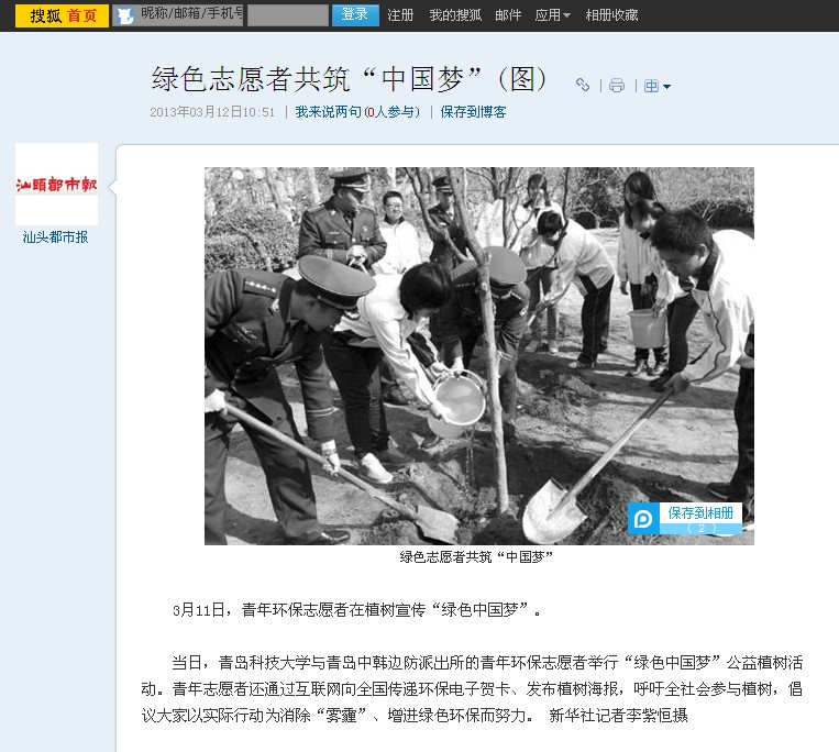 3月11日上午,公司员工与青岛中韩边防派出所警官在四方校区校园里举行“绿色中国梦”公益植树活动。提倡全社会参与种树,倡导以实际行动来“护树”,倡议社会各界用实际行动消除“雾霾”,增进绿色环保,实现“绿色中国梦”。人民日报、新华每日电讯、新华网、和讯网、新民网、新快网、新浪、网易、搜狐、宁夏新闻网、荆楚网、内蒙古日报、楚天金报、北京晚报、齐鲁晚报等10余家媒体进行了关注和报道。