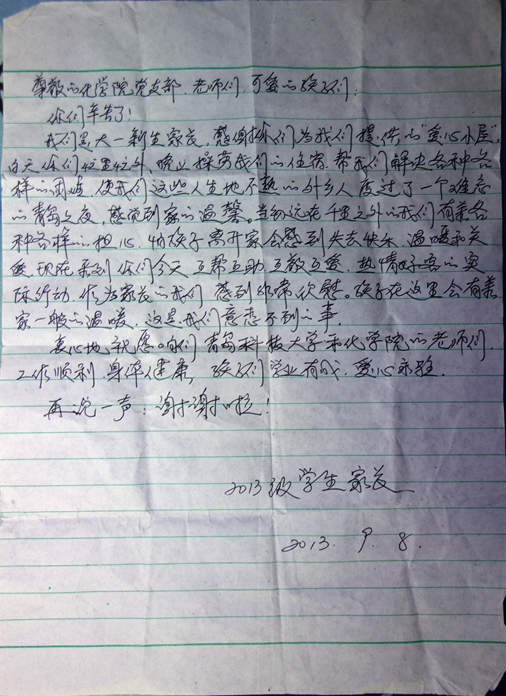 9月11日,bw必威西汉姆联官方网站分团委收到一封从湖北寄来的感谢信,寄信人是一名今年刚刚入学的新生家长,信中表达了对公司和公司迎新工作的感谢,特别表达了对“爱心小屋”温馨服务的感谢。
