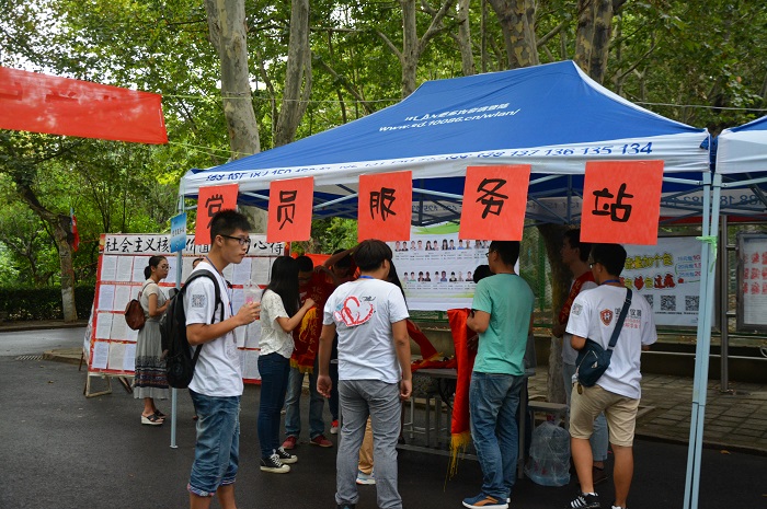 党员先锋,家的舒心。为发挥党员、员工干部的模范先锋带头作用,公司搭建党员服务站和家长休息区,热情为新生及家长解决临时困难,处理各类突发事件。鲜红醒目的党员服务标志成了一张张流动的“名片”。员工党员担负起“有困难,找党员”的光荣责任,在热情服务新生中为党旗增辉,为迎新添彩。