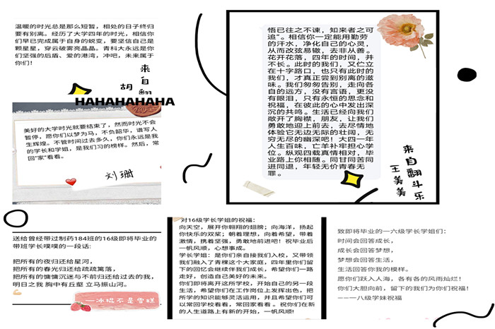 活动中,收到了来自各公司大一、大二、大三员工对毕业生的祝福,大家共同预祝学长、学姐毕业快乐,在未来的工作、科研岗位上能顺利,取得优异成绩。毕业生们也纷纷表达自己在大学的遗憾,其中包括学习、情感、交友等方面的遗憾,同时也对学弟学妹们提出建议:“要珍惜大学的美好时光,努力学习,不要时间已经被虚度后再后悔,有梦想一定要勇敢得试一试。”