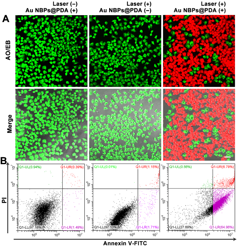 此外,Au NBPs@PDA相比于纯Au NBPs具有更高的光热特性,能够更有效地杀死癌细胞(图3),显示出了这种诊疗一体化平台在精确诊断和肿瘤治疗方面的应用潜力。