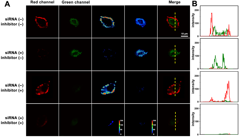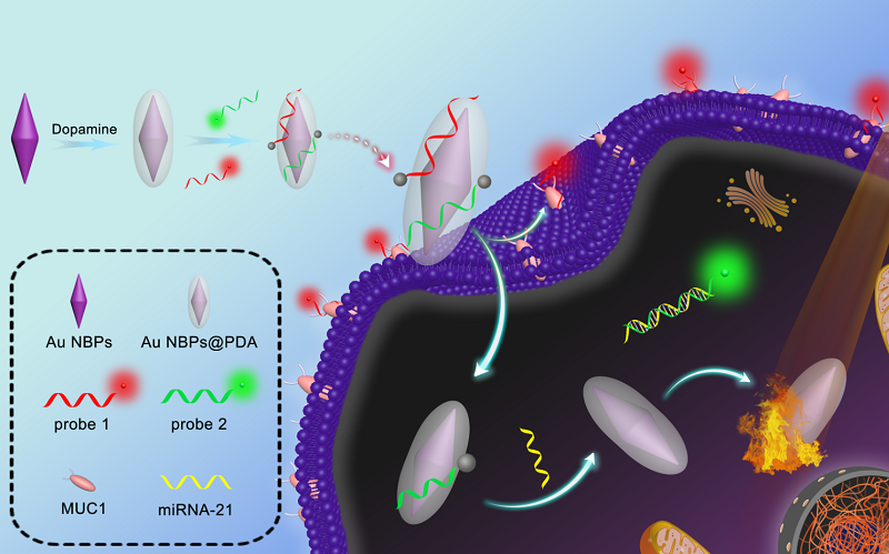 多个肿瘤标志物同时检测可以大大提高癌症诊断的准确性和可靠性,然而目前报道的多个肿瘤生物标志物同时检测的工作大多集中在检测单一类型标志物(如,两种蛋白质或两种核酸),这在某种程度上限制了多种类型标志物的研究。原位同时获取细胞内不同空间位置分布的两种不同类型肿瘤标志物(一种蛋白质和一种核酸) 信息不仅能够实时显示癌细胞的生理状态并且消除假阴性或假阳性信号,还可以更准确的定位癌症的病变位点信息,对于癌症的精准早期诊断至关重要。