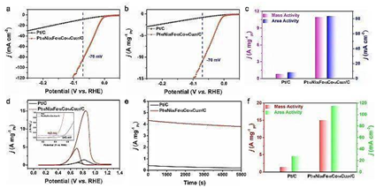 图2. Pt18 Ni26 Fe15 Co14 Cu27 /C 和 Pt/C 催化剂的HER和MOR性能测试及分析