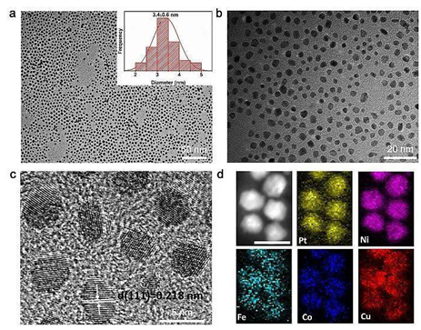 图1. Pt18 Ni26 Fe15 Co14 Cu27 纳米颗粒的形貌表征。