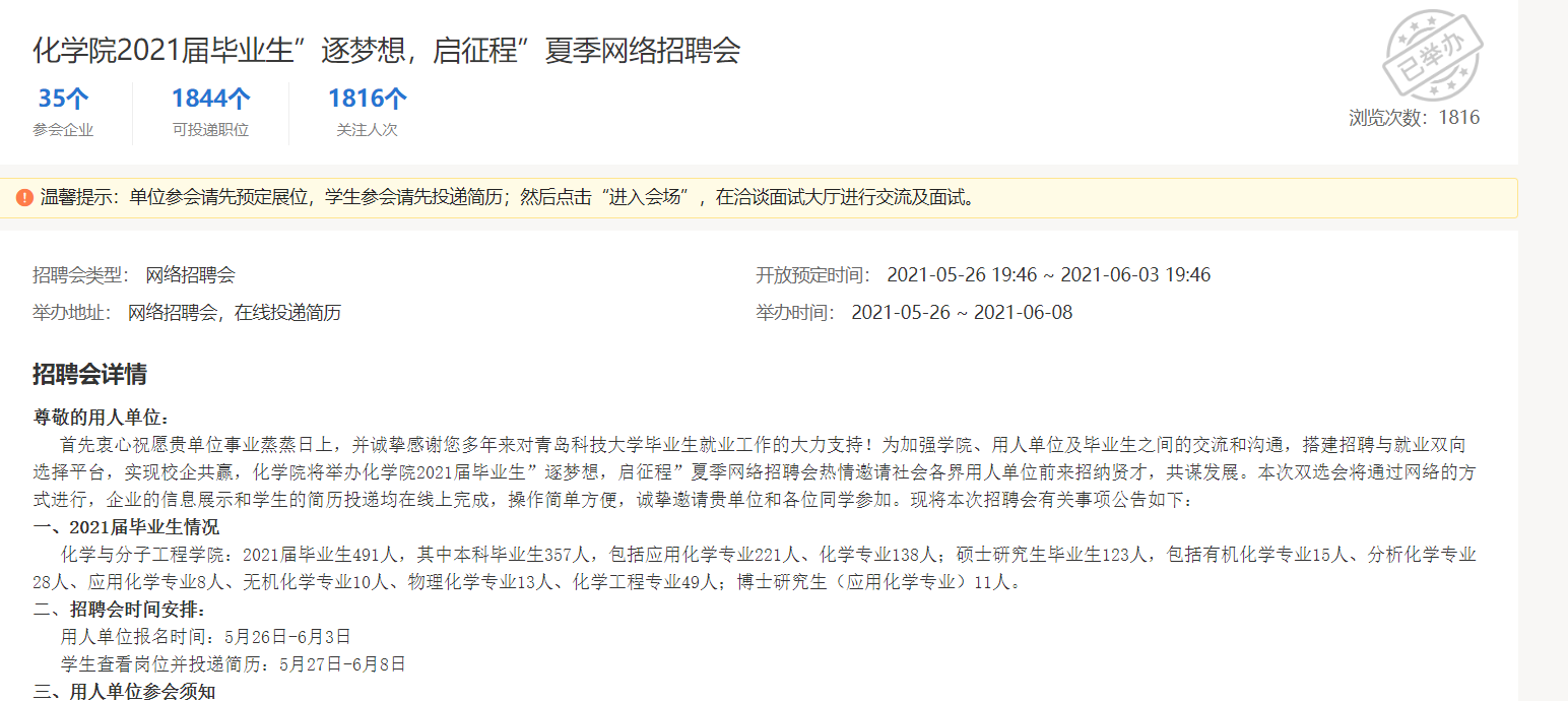 本次招聘会共吸引青岛清原抗性杂草防治有限公司等35家公司参加,提供可选职位共1844个,数十名毕业生与招聘企业达成就业意向。