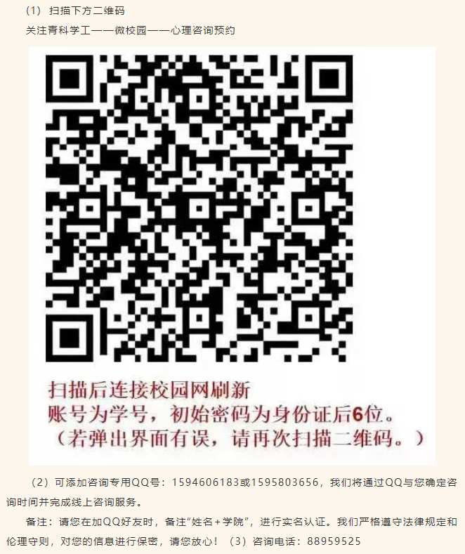 七是及时寻求专业帮助。如果负性情绪持续时间比较长、对生活学习失去信心和兴趣、饮食和睡眠习惯日益恶化、影响到正常生活,自己无法解决时,应及时报告辅导员,并寻求学 校心理中心精神卫生、心理健康专业人员的帮助。公司心理中心为全校员工提供线上心理咨询服务。预约方式如下:(1)关注青科学工——微校园——心理咨询预约(2)可添加咨询专用QQ号:1594606183或1595803656,(3)咨询电话:0532-88959525(大家要牢记这个电话哟)