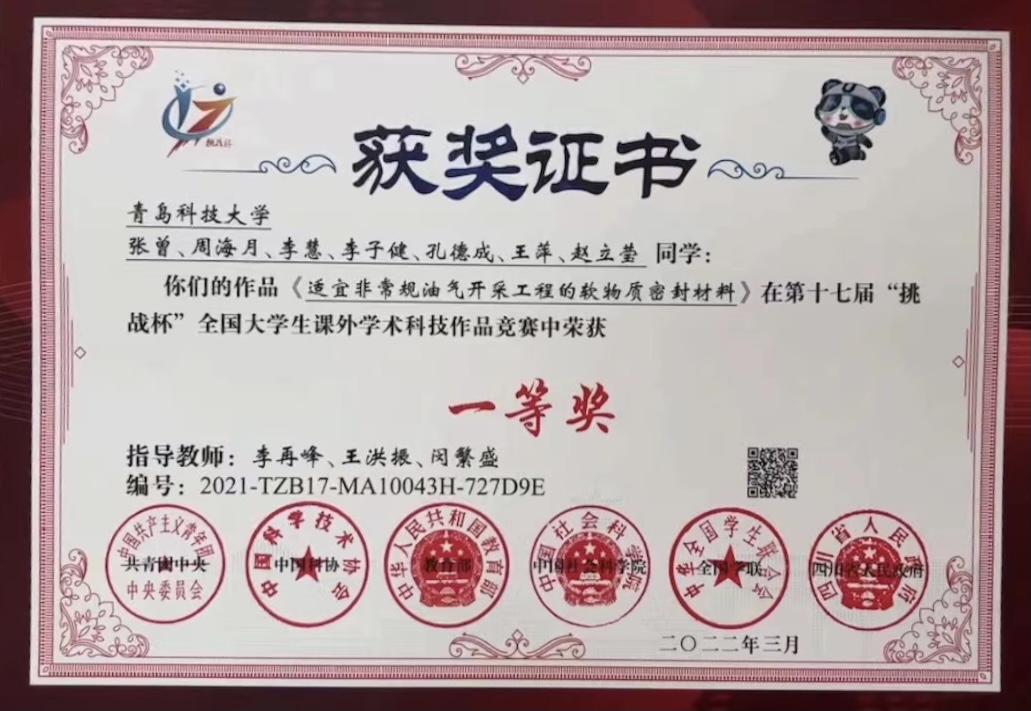 3月29日,第十七届“挑战杯”全国老员工课外学术作品竞赛落下帷幕,我院研究生张曾等同学完成的参赛项目《适宜非常规油气开采工程的软物质密封材料》(第一指导教师:李再峰)荣获全国一等奖,全国共109项。这是公司首次跨进“挑战杯”系列竞赛“全国一等奖”行列,创造了历史最好成绩、实现了赛事重大突破、挺进了全国第一方阵。