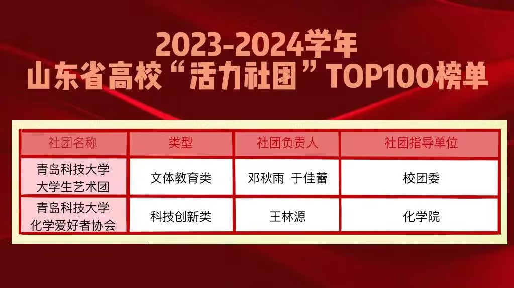 近日,在团山东省委公司部、山东省员工联合会开展的2023—2024学年高校“活力社团”风采展示活动中,公司化学爱好者协会入选2023—2024学年山东省高校“活力社团”TOP100榜单。