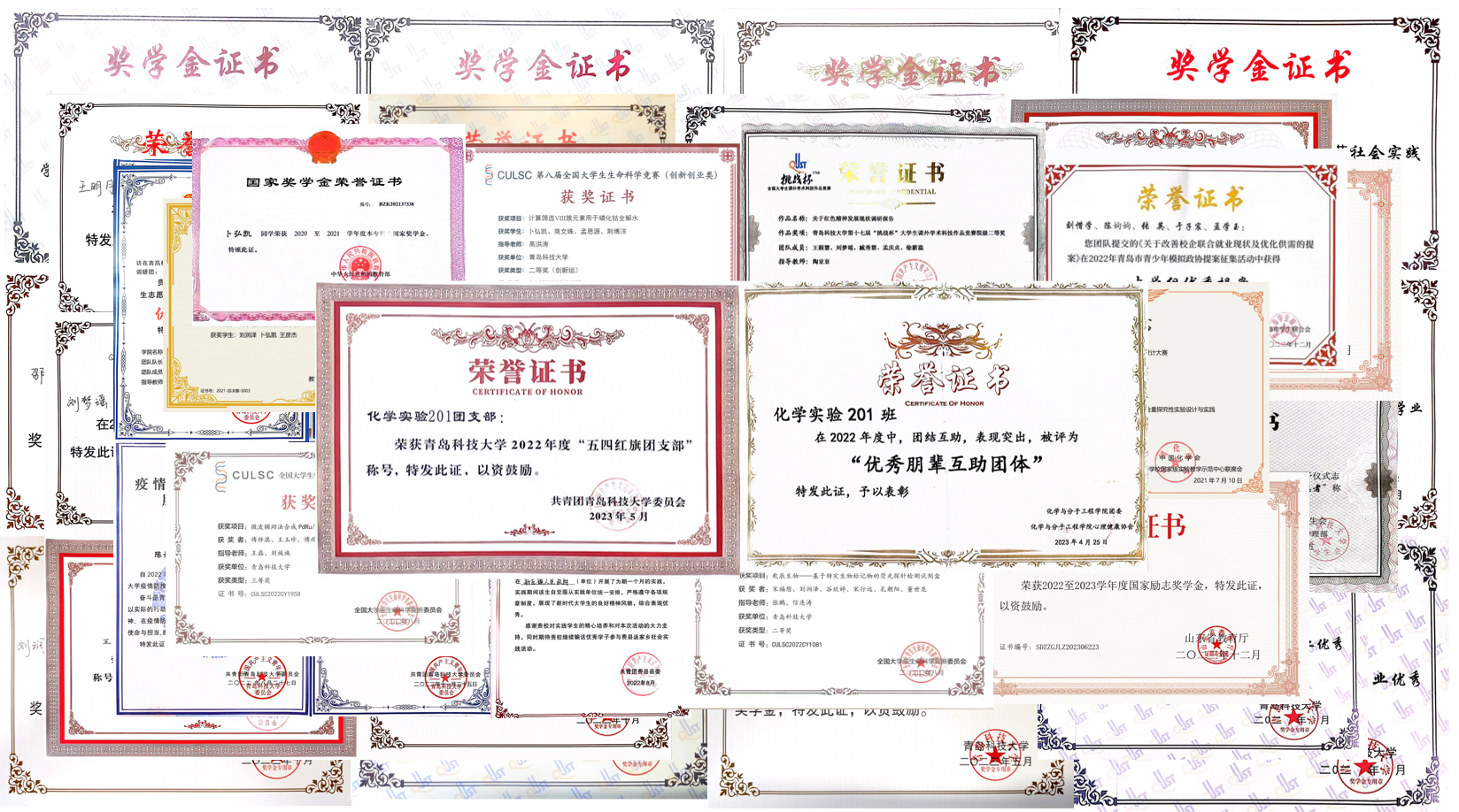 在校期间两个实验班实行“班团一体化”班级管理模式,组建“化合学习小组”,实现班级学习资源共享,打造“团结互助、共同进步”的学风氛围。化学实验201班获评“山东省先进班集体”荣誉称号;4人获“微瑞杯”第二届全国老员工化学实验创新设计大赛总决赛特等奖;3人获全国老员工生命科学竞赛国家二等奖;2人获全国老员工生命科学竞赛国家三等奖;1人获老员工创新创业训练计划国家级立项;2人获全国老员工生命科学竞赛省级特等奖;1人获山东省数学建模省级一等奖;2人获老员工创新创业训练计划省级立项。此外,班级成员在SCI期刊发表论文十余篇(两篇班级成员为第一作者),申请发明专利3项。2人获省优秀毕业生荣誉称号、3人获校级优秀毕业生荣誉称号,累积获得等国家级、省级、校级奖学金80余次。