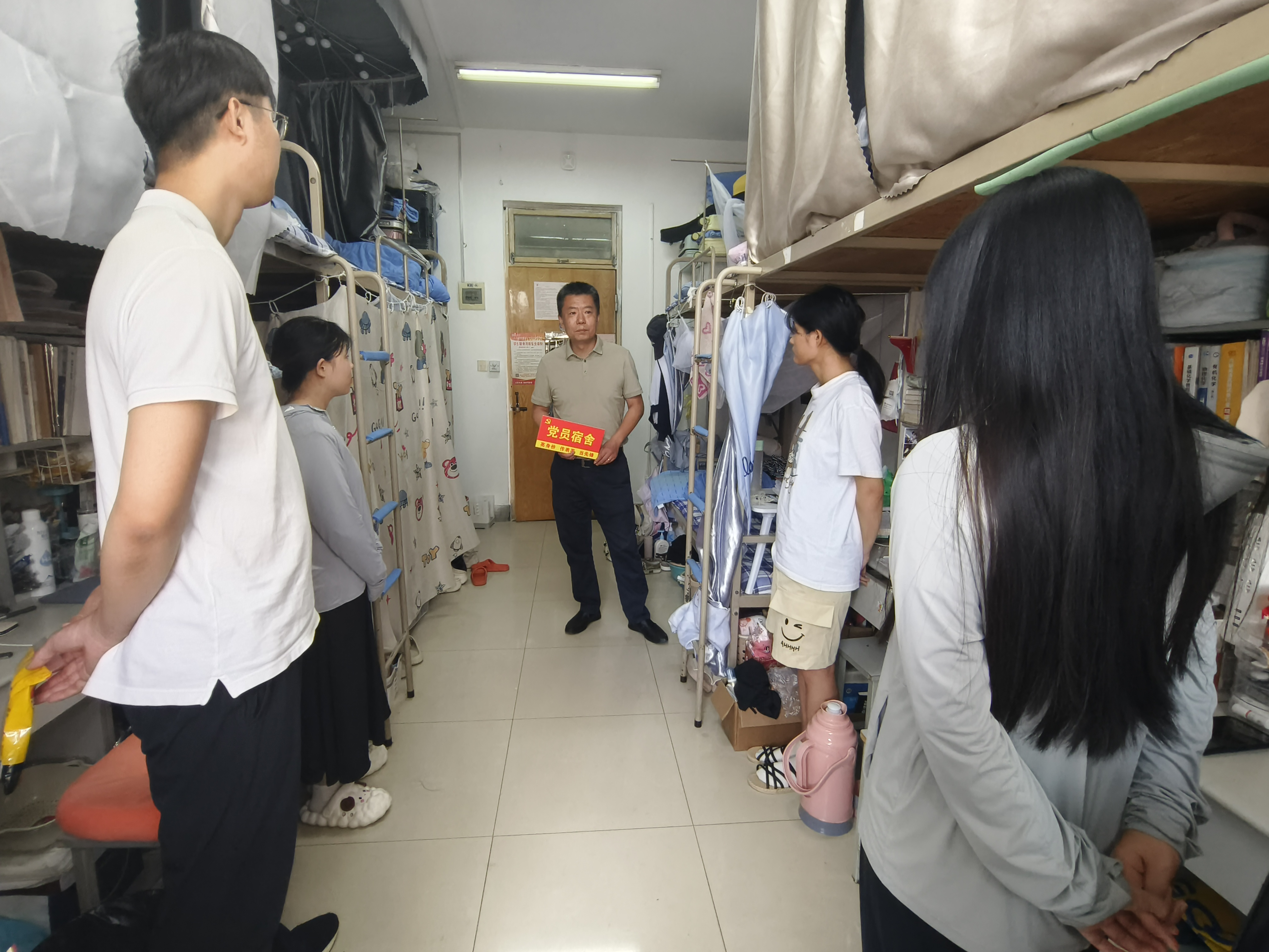 活动中,老师与同学们亲切交流并为员工党员代表颁发“党员宿舍”标牌。刘尧强调一名党员就是一面旗帜,勉励员工党员要以身作则、率先垂范,带头营造“平安、健康、文明、和谐”的宿舍氛围。