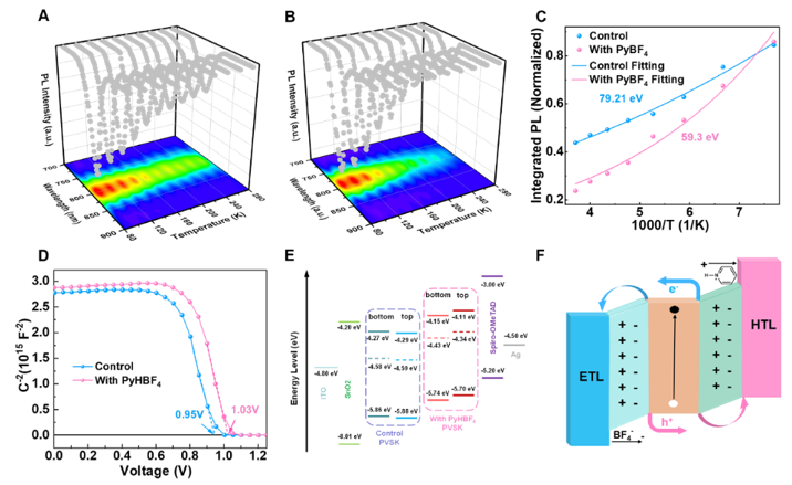 钙钛矿太阳能电池的界面工程是提升器件性能的关键策略之一,其中界面偶极层的构建能够有效调控能级排列并减少非辐射复合。然而,现有研究通常仅针对单一界面(如钙钛矿/电子传输层或钙钛矿/空穴传输层界面)进行修饰,且多采用复杂的多组分处理体系。目前,尚未有研究报道通过单一化合物后处理在n-i-p型器件中同时实现钙钛矿/ETL和钙钛矿/HTL界面双偶极层构建的案例。这一技术空白限制了界面协同优化的潜力,也增加了工艺复杂性。针对这一问题,周忠敏教授团队采用离子液体四氟硼酸吡啶鎓(PyHBF4)作为多功能界面修饰剂,通过其阴离子(BF4−)与钙钛矿骨架的动态离子交换作用,在钙钛矿体系中实现了贯穿体相至双界面的偶极层定向构筑。通过揭示PyH+对I−的选择性结合机制及BF4−沿Pb-I框架的迁移路径,阐明了双偶极层的自形成动力学。这种与内置电势方向一致的偶极层设计,结合π-π堆积效应和缺陷钝化作用,为同步提升器件的光伏性能和环境稳定性提供了新思路。