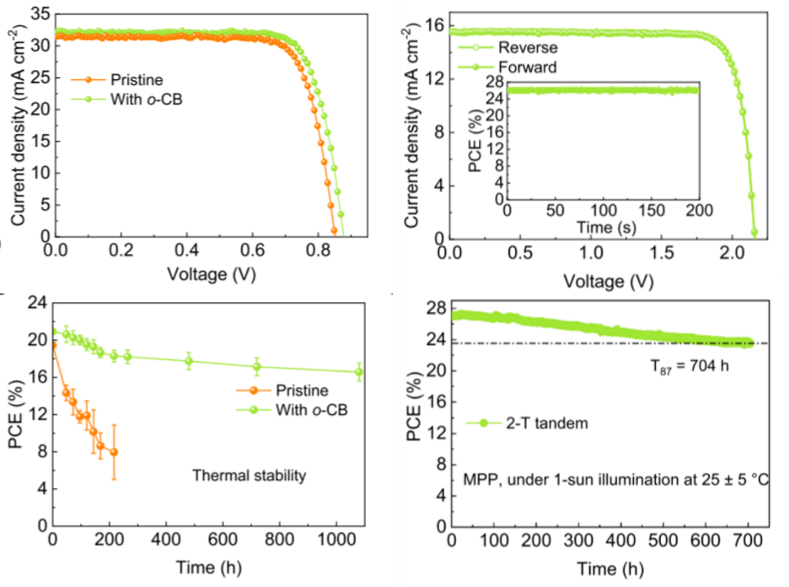 结果表明, 邻碳硼烷处理器件的冠军PCE达到23.4%, 利用电子离域碳硼烷调节散热和促进电荷转移的混合锡铅和串联太阳能电池。通过应用碳硼烷处理,有效抑制了局部热积聚区域(热点)的出现,从而改善了长期热稳定性。在85°C下老化1080小时后仍能保持其初始效率的80%。当集成到单片全钙钛矿串联叠层中时,实现了超过27%的效率。串联电池在光照下连续运行704小时后仍能保持其初始效率的87%。这项工作将有效推动钙钛矿太阳能电池的商业化。