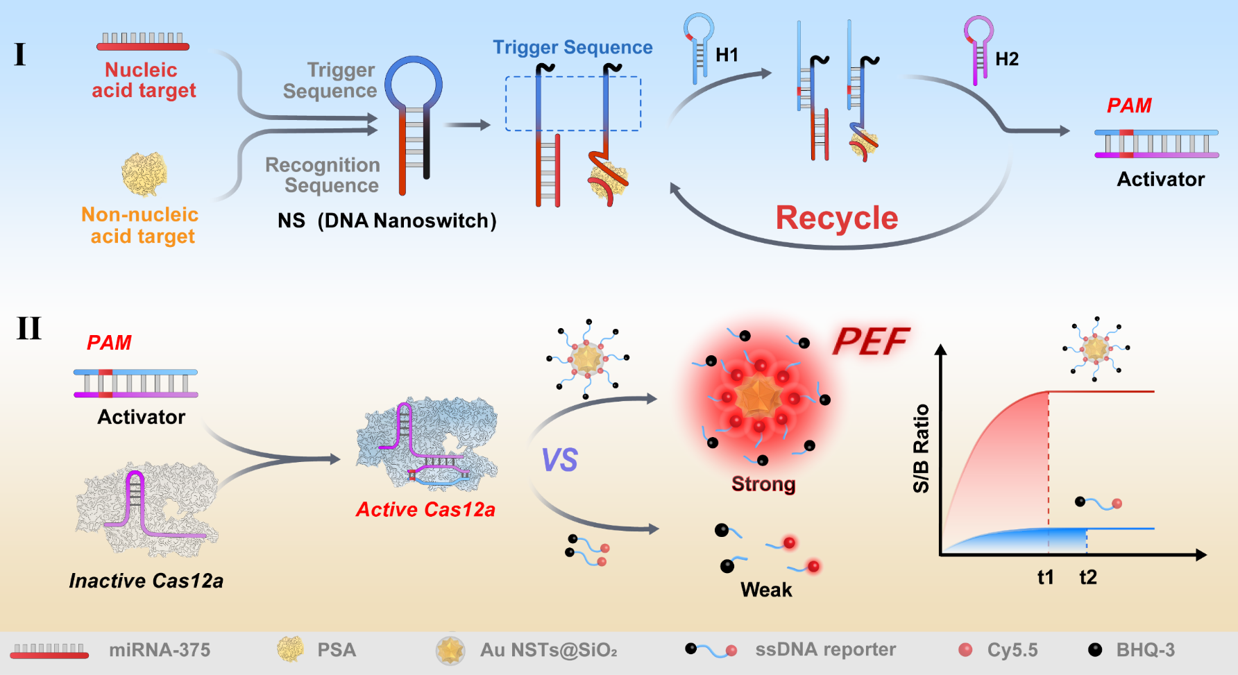 针对上述科学问题,bw必威西汉姆联官方网站罗细亮/徐升豪课题组基于前期等离子体激元共振增强荧光(PEF)的高灵敏精准分子检测的工作基础上(Chem. Sci. 2024, 15, 566-572; Anal. Chem. 2024, 96, 16971–16977; Anal. Chem. 2024, 96, 4402-4409; Anal. Chem. 2023, 95, 3525-3531; Anal. Chem. 2022, 94, 5399-5405; Anal. Chem. 2022, 94, 16887-16893; Anal. Chem. 2022, 94, 14467-14474; Anal. Chem. 2021, 93, 2480-2489),开发了一种基于可编程DNA纳米开关(NS)调控的等离子体CRISPR-Cas12a金纳米星(Au-NST)报告平台,并且在空间限制效应的辅助下实现了核酸和非核酸生物标志物的检测(图1)。通过改变NS的识别区域序列,核酸(miRNA-375)和非核酸目标物(PSA)均能打开NS使其暴露出相同的CHA触发序列,经过CHA反应后释放出相同的激活器(双链DNA)并激活Cas12a,实验表明该设计仅需要改变NS的识别区域序列,便可利用一种crRNA实现两种不同类型目标物的检测(图1)。