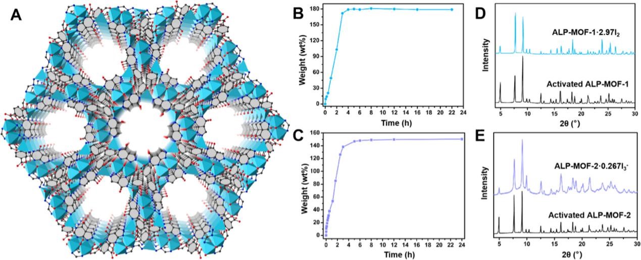 图1. ALP-MOF-1 and 2单晶结构、碘吸附曲线和PXRD表征。