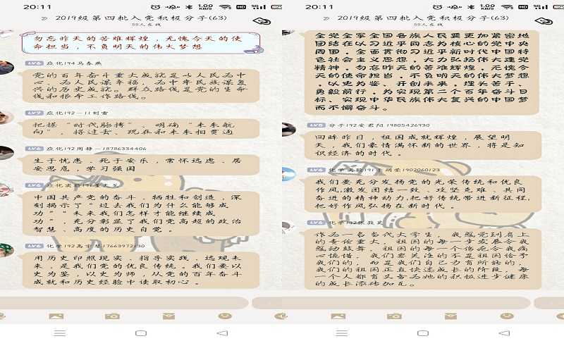 在随后的交流中,员工党员刘德洋、郑德波等结合自身学习工作实际,围绕学习贯彻党的十九届六中全会精神作了现场交流发言。刘德洋说:“作为一名员工党员,我们要不断学习,勇毅前行,还要勿忘昨天的苦难辉煌,无愧今天的使命担当,不负明天的伟大梦想,做一名有志气、有骨气、有底气的新时代中国青年。”郑德波谈到:“作为新时代中国青年,我们要自觉接受党的教育、管理和监督,严以律己,勤奋务实,立足本职,扎实工作,积极为同学办实事,从党的光辉历史中汲取前进的力量,不断提高自己的学习能力和水平,用青春与奋斗交出一份优异的答卷!”会后,2019级入党积极分子围绕学习宣传贯彻党的十九届六中全会精神,结合自己感悟纷纷在线上留言。