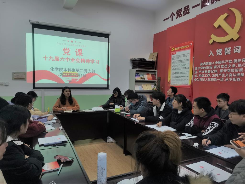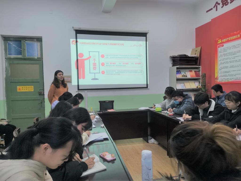 12月1日,本科生第二党支部书记刘施施,在党建活动室为本科生第二党支部全体党员讲授“学习党的十九届六中全会”专题党课。