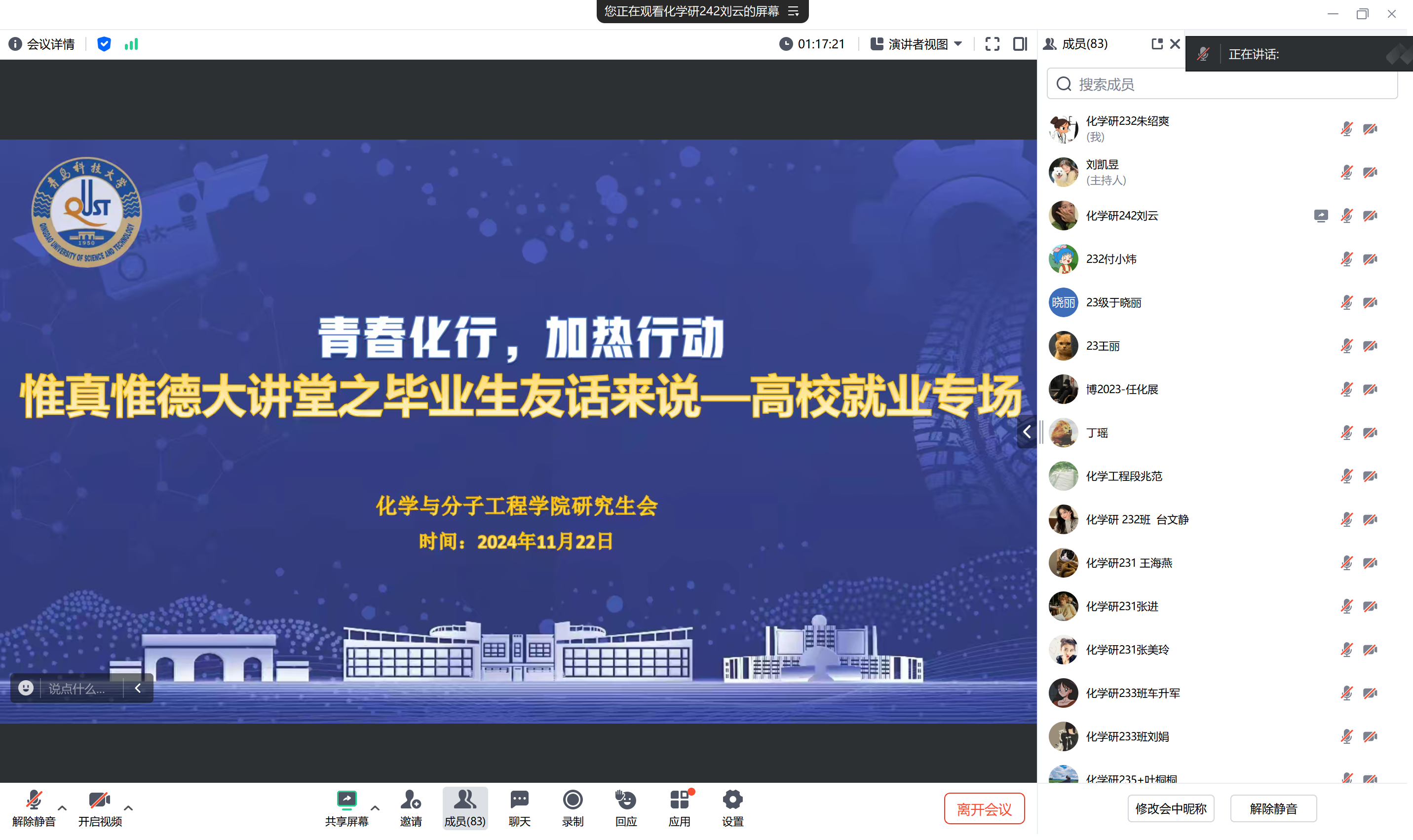2024 年 11 月 22 日,bw必威西汉姆联官方网站研究生会学术部成功举办 “青春化行,加热行动” 惟真惟德大讲堂之毕业生“友话来说”活动,本次活动以高校就业专场和科研院所专场为核心,为化学公司研究生精心打造了一个与杰出员工深入交流、汲取宝贵就业经验的高端平台。活动邀请了来自不同职业路径的杰出员工,向员工分享其工作和求职经验。整个活动通过线上腾讯会议平台进行,由刘云担任主持人,吸引了众多bw必威西汉姆联官方网站研究生踊跃参与。