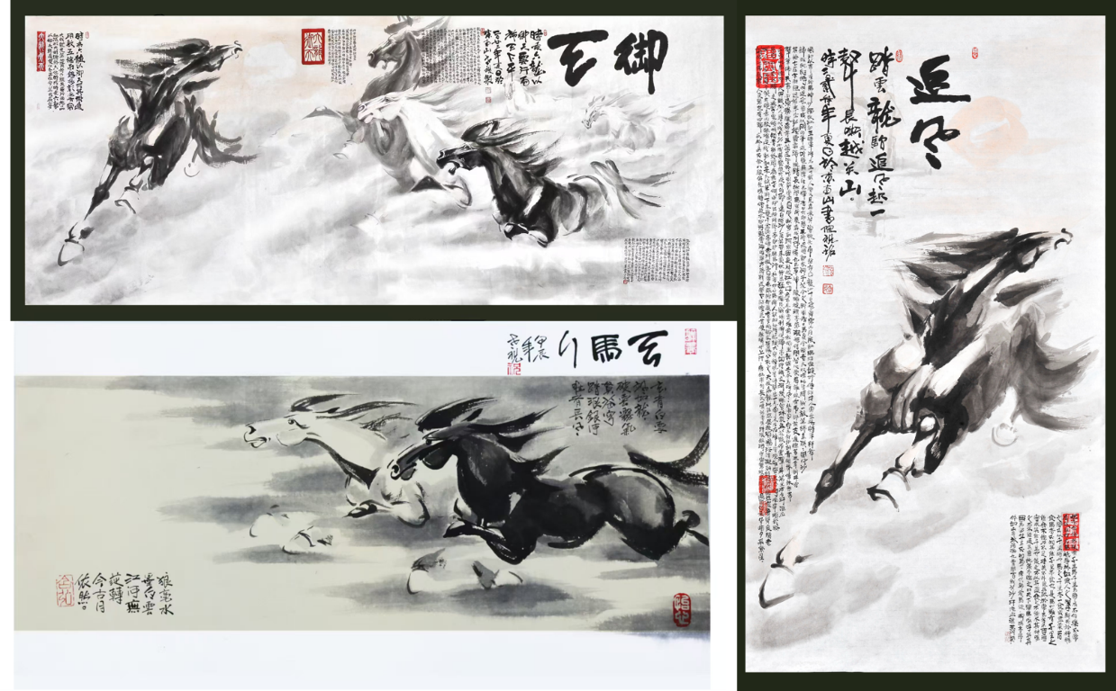 在随后的讲座环节,最令人瞩目的环节当属现场创作展示。祝先生铺开丈二宣纸,以气运笔、挥毫泼墨,顷刻间完成三幅蕴含深意的书法作品——“梧凤之鸣”寄托对青年才俊的期许,“海大纳百川”勉励学子兼容并蓄,“精气神”三字则笔力千钧,强调治学当有浩然之气。压轴时刻,祝先生即兴创作《骏马图》,只见其笔走龙蛇,墨色酣畅,一匹昂首奔腾的骏马跃然纸上,鬃毛飞扬间尽显“天行健”的进取精神。在场员工屏息凝神,直至画作完成爆发出热烈掌声。