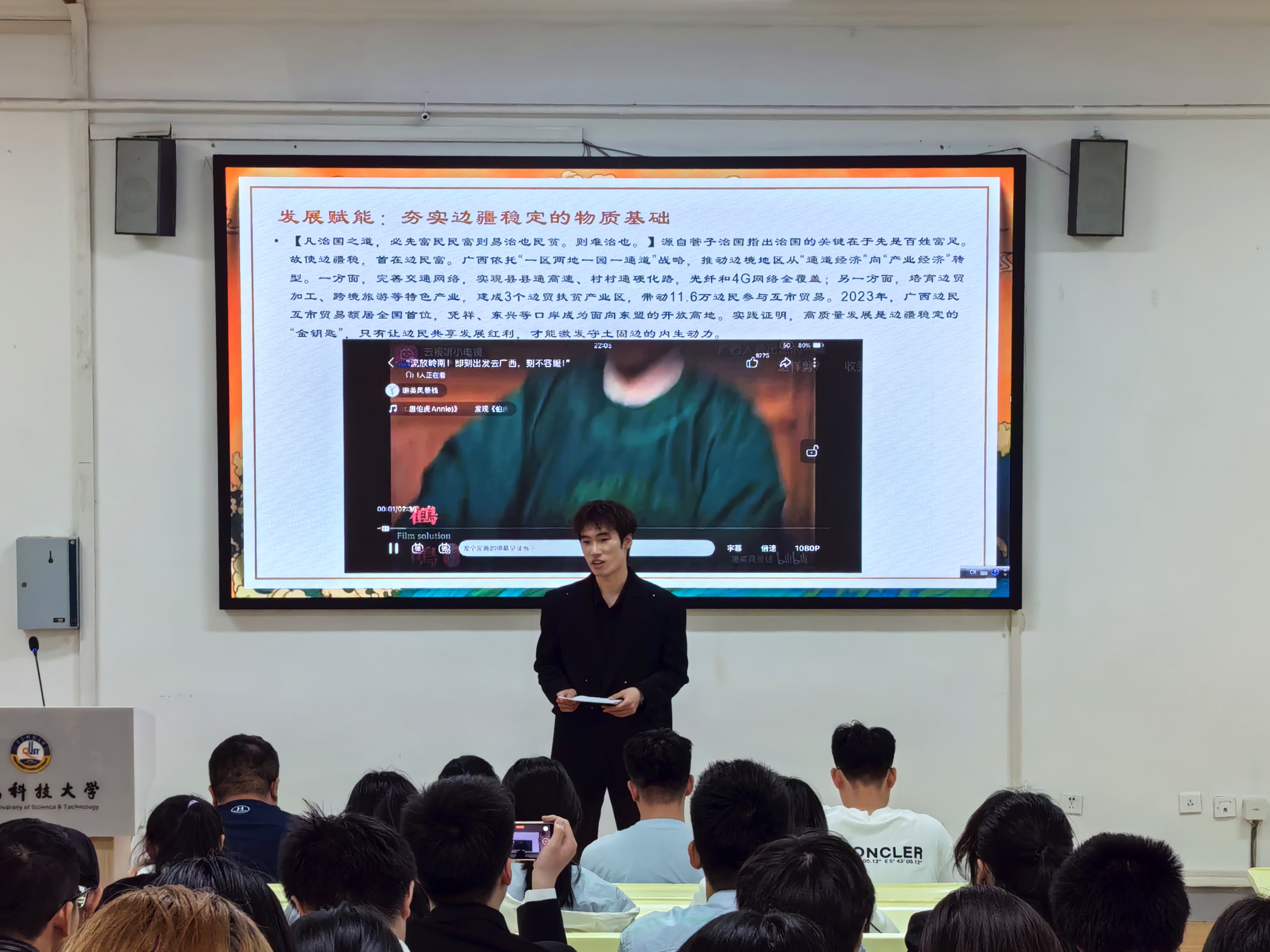 比赛当天,同学们纷纷展现出自己的实力。大家围绕“爱我国防”这个主题,用不同的方式表达对国防事业的理解和热爱。有的同学讲述人民军队一路走来的艰辛历程,分享自己对军队历史和新时代使命的感悟;有的同学结合国家政策,谈到如何守护广西边疆,让边疆地区稳定发展;还有的同学结合习近平强军思想,表达自己对国家的热爱,以及对实现中国梦、强军梦的理解。同学们真情实感的演讲,感染了在场的每一个人,赢得阵阵掌声。