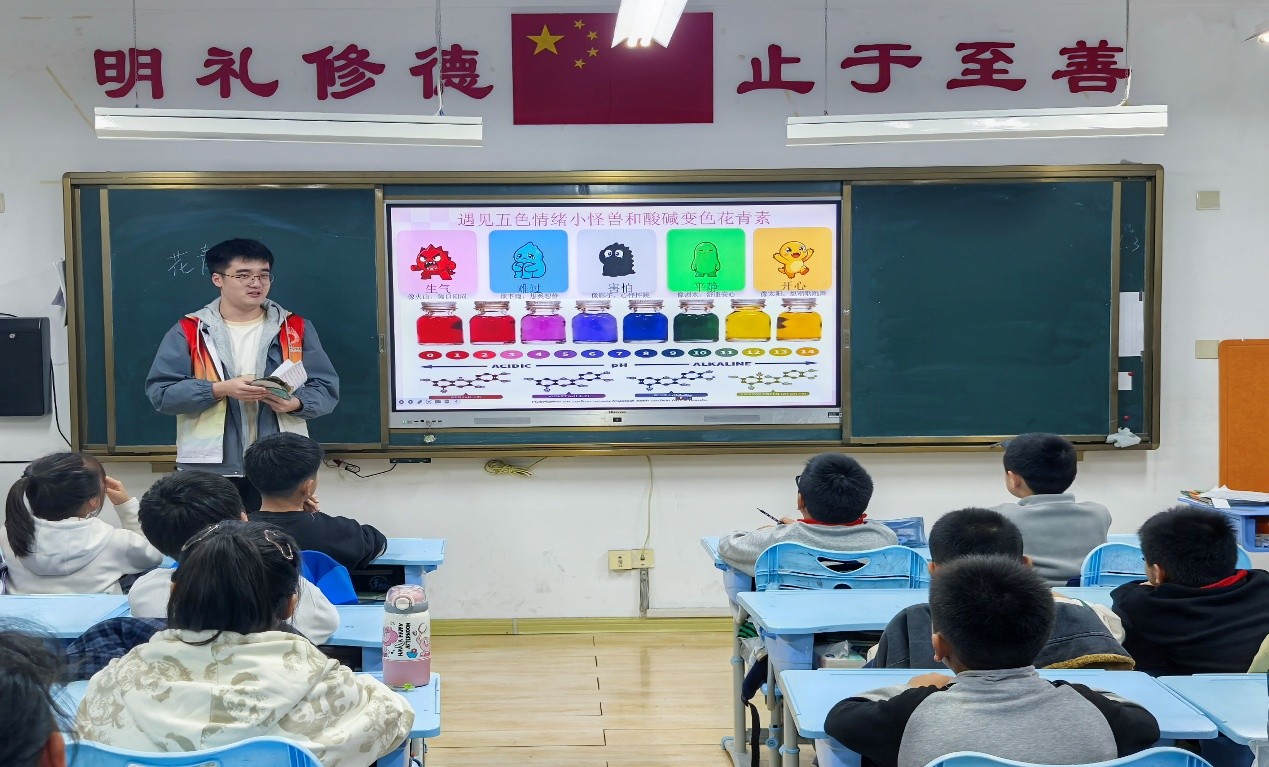 承接化学实验的启发,心理健康协会的志愿者引导孩子们将花青素的颜色变化与情绪体验巧妙联系。通过引入“五色情绪小怪兽”这一生动比喻,志愿者帮助同学们认识到,正如花青素会随环境呈现不同色彩,人的情绪也会因情境变化而产生波动,这都是正常的生命体验。通过这种寓教于乐的方式,同学们在轻松的氛围中逐渐学会认识、接纳并调节个人情绪,从而建立起更为积极的情绪管理能力。
