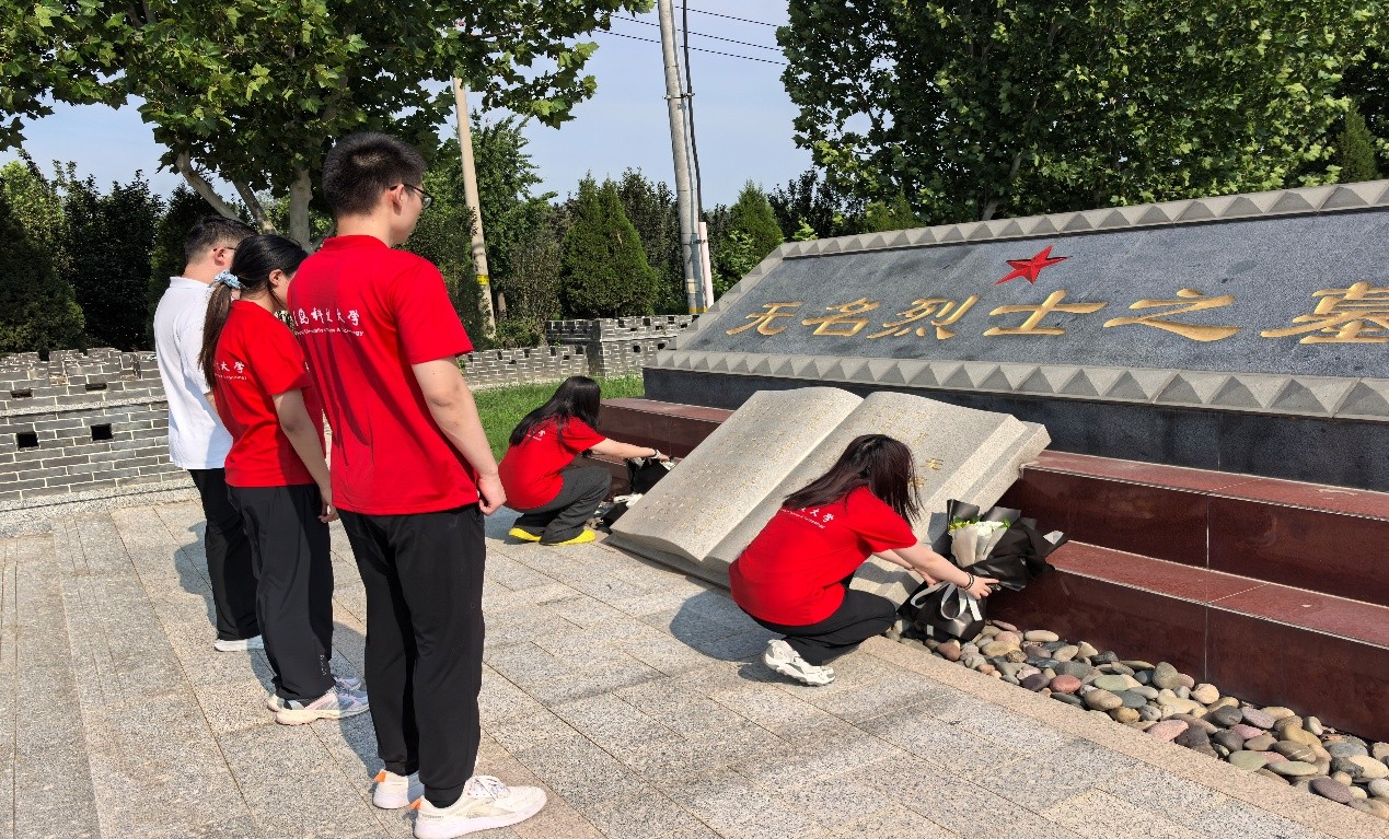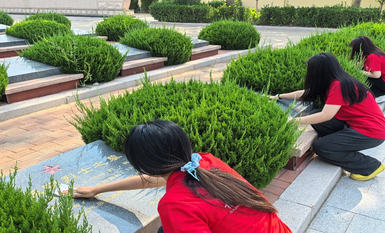 在德州市革命烈士陵园,实践团队进行庄严肃穆的缅怀仪式。队员们列队肃立,向革命烈士纪念碑敬献花篮,并俯身细致擦拭烈士墓碑,每一处擦拭都凝聚着对先烈无限的崇敬与追思。在静谧的陵园中,队员们现场聆听讲解,了解长眠于此的英雄事迹,深刻感受革命战争年代的烽火岁月与牺牲奉献,在庄重氛围中接受一次深刻的理想信念教育和精神洗礼。