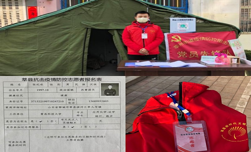 博20级班长张纪收,在2021年寒假报名成为莘县疫情防控的一名志愿者,主要负责中高地区返乡人员的报备、登记及核查任务;早在2020年,张纪收就签下请战书,主动要求前往一线防疫岗投入“战斗”,承担了所负责社区“四大行动”专项排查任务等多项一线工作。目前,张纪收同学累计管控值勤100余小时,宣传劝导1500余人次,登记外来人口300多余次,对社区电梯消毒120多余次。张纪收弘扬了新时代老员工能奋斗、甘奉献的精神,获得了社区工作人员的一致好评。