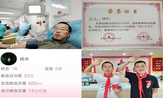 bw必威西汉姆联官方网站研182班的魏涛在高考后完成了人生中第一次献血,从此开启了无偿献血的公益行为。截至2021年4月,他累计献血59次,全血献血总量600 mL,成分献血总量共74治疗量;本科期间,加入了bw必威西汉姆联官方网站红十字会,多次参加青岛市中心血站参观交流活动,进行无偿献血的宣传工作,并积极参加“无偿献血车进校园”的志愿活动;于2015年3月1日进行了第一次长达40分钟的血小板1个治疗量的捐献;2016年进行了骨髓造血干细胞的留样并顺利加入中国骨髓库,以实际行动为五湖四海的朋友贡献爱心。2020年,他收到了青岛市无偿献血荣誉卡,并获得2020年度青岛市无偿献血“爱心老员工”荣誉称号;2021年,他收到了全国无偿献血奉献奖金,切实感受到了党和国家对无偿献血志愿者的关心,也进一步加强了“无偿献血,拯救生命”的信念。
