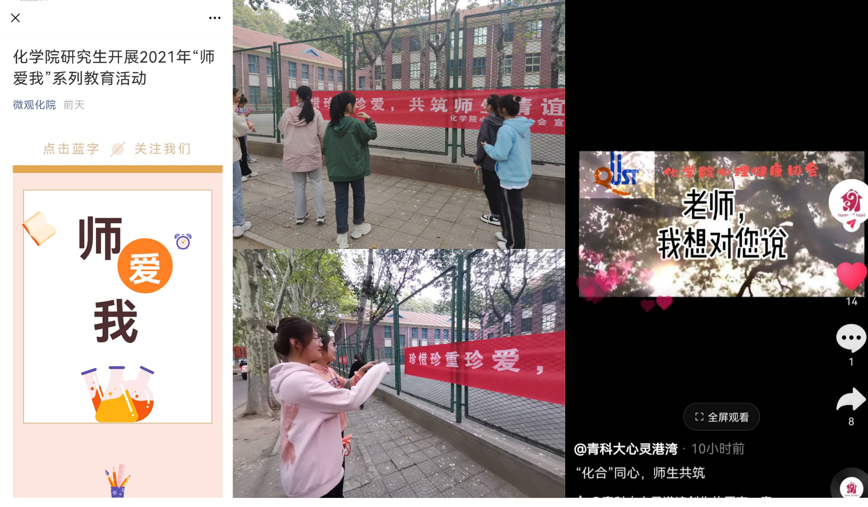 开展师爱我活动宣传。首先,面向全体同学进行了“老师我想对你说”主题短视频拍摄征集,获得同学们的积极参与,并在抖音平台进行投稿宣传,获得大量点击关注,引起热烈反响。同时,在校园内开展了师爱我活动横幅的张贴,并通过校园广播在当天开展师爱我相关内容的宣传,在微观化院公众号上进行师爱我活动以及心理健康知识的普及与介绍。