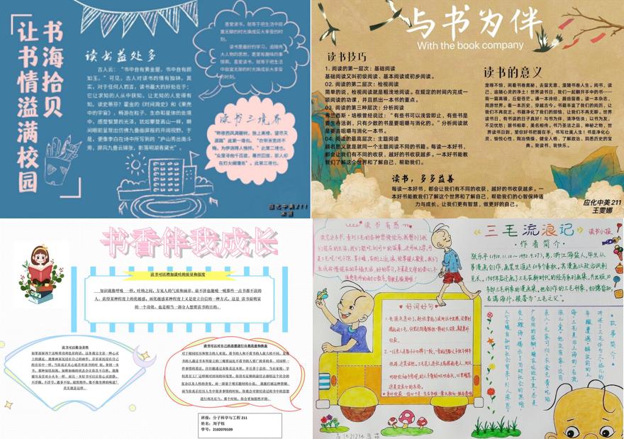 读好书,腹有诗书气自华。“书海拾贝,让书情溢满校园”,同学们绘制手抄报,设计精美书签、节徽,激发人人参与的热情与兴趣;“最是书香能致远”,同学们以自己最喜欢的书的同人番外或续写,将自己理解的人物形象刻画生动,加深了对原著认识,吸引更多的人去阅读原著;“我心中的英雄”,伟大建党精神、抗疫英雄,同学们以文字表达对自己心中英雄的敬仰之情,字字撼心,令人为之动容。