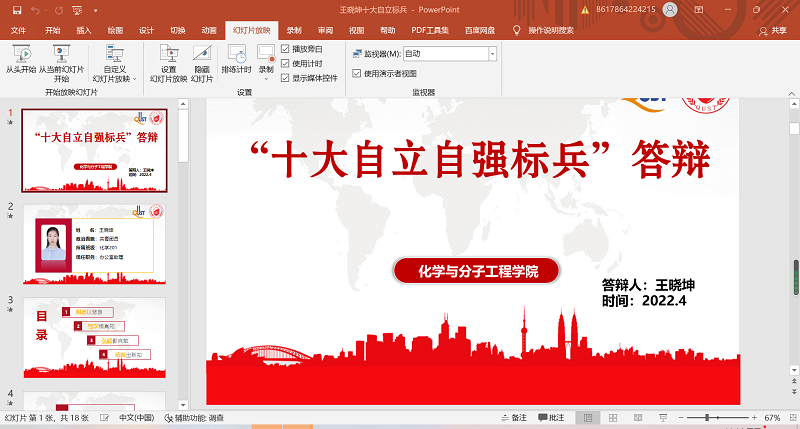 各位候选员工依据抽签顺序依次答辩,他们分别从所获资助、学业成绩、学科竞赛、员工工作、公益服务等方面汇报了自己入学以来的成长及变化。答辩现场满满的正能量,各位候选员工向参会师生充分展示了他们的自强不息、奋发向上的先进事迹。