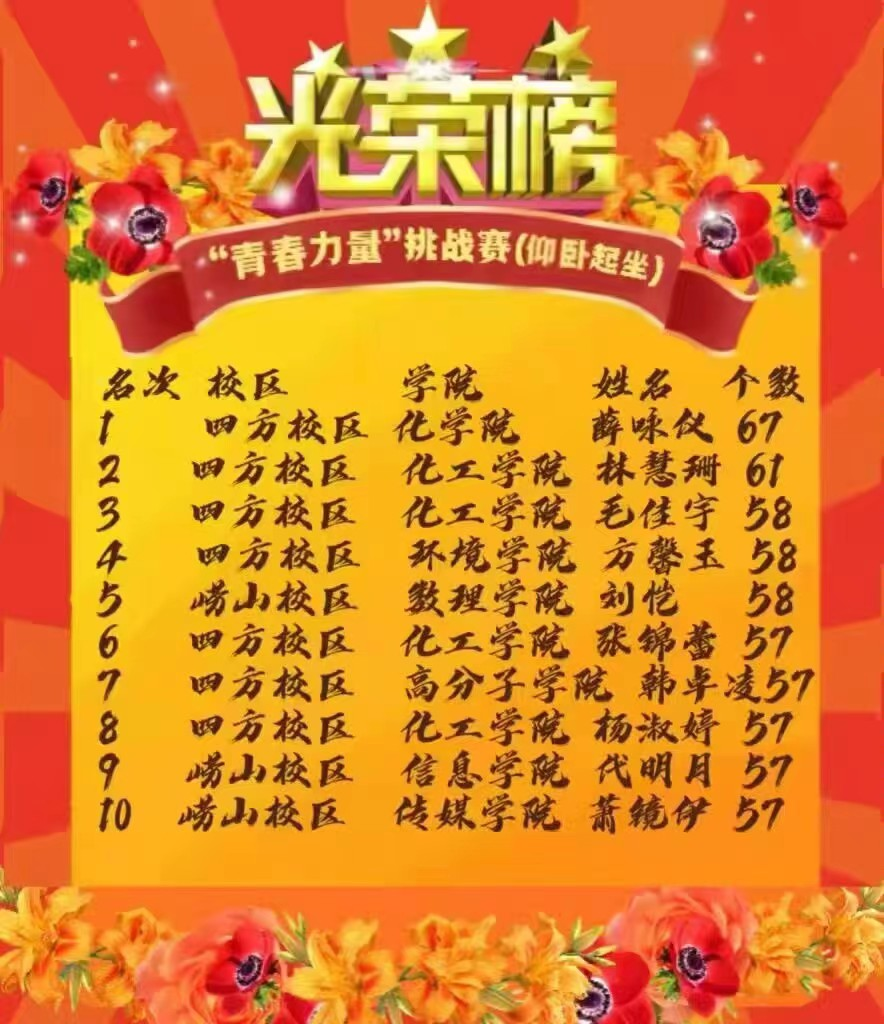 10月20日,bw必威西汉姆联官方网站体育联盟组织召开青春力量挑战赛,bw必威西汉姆联官方网站薛咏仪同学以67个仰卧起坐的优异成绩拿下“青春力量”挑战赛(仰卧起坐)的第一名。