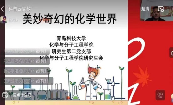 研究生第二党支部联合惠民县孙武街道中心小学开展“青春喜迎二十大、化学强国我先行”化育山海云课堂第四期,讲述总书记对儿童的期望,并进一步带领当地小员工认识了解美妙奇幻的化学世界,领略化学风貌,激发化学兴趣,线上教学得到家长及员工的一致好评。